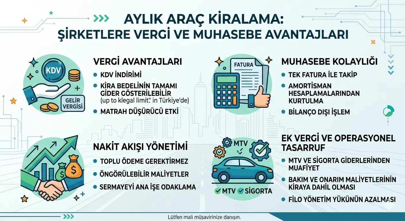 Aylık araç kiralama faturaları, genel olarak faaliyet gideri olarak muhasebeleştirilir. Bu durum, giderlerin doğrudan vergi matrahından düşülmesini sağlar. Araç satın alımında ise maliyetler amortisman yoluyla yıllara yayılır ve vergi avantajı kısa vadede sınırlı kalır. Kiralama modeli, vergi avantajını daha hızlı ve net şekilde hissettirmesi açısından öne çıkar.